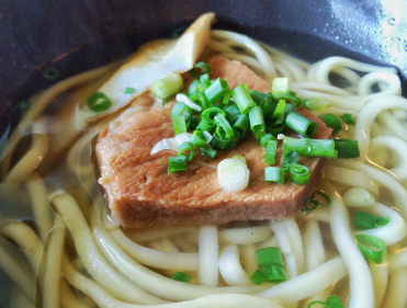 沖縄そばをアレンジし食べ応えのあるロース肉と波型のかまぼこを使用した、当店オリジナルの看板そば。